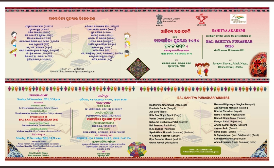 சாகித்திய அகாடமியின் ‘பால சாகித்திய புரஸ்கார் 2020’ விருது வழங்கும் விழா, ஒடிசா மாநிலத் தலைநகர் புவனேஸ்வரத்தில் வைத்து நடைபெற உள்ளது. இம்மாதம் (நவம்பர்) 14, 15ஆம் நாட்கள் என்று முடிவு செய்துள்ளனர். நிகழ்வில் கலந்துகொள்ள ஒடிசா செல்கிறேன். பருவநிலை ஒத்துழைப்போடு, எவ்வித தடங்கலும் இன்றி பயணம் நிறைவேறவேண்டும் என்பதே இப்போதைய அவா! (அடித்து துவைக்கும் மழை, அன்றைய நாட்களில் கொஞ்சம் ஓய்வெடுக்கவேண்டும்)